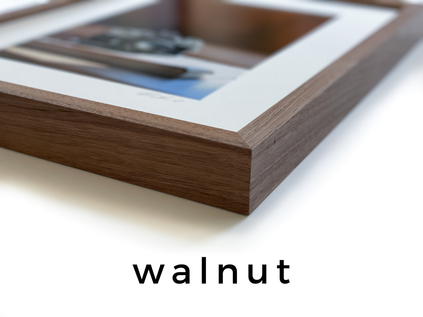 Frames are made custom to order. Photos are printed on archival-quality paper, mounted on premium backing board, matted with a thick white matte, and fitted into a solid maple or walnut wood frame with a high-quality, scratch-resistant glass. Arrives ready to hang.